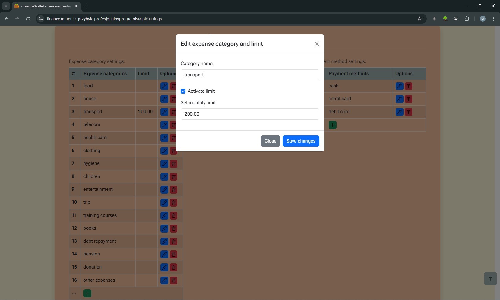 Celem projektu było zaprojektowanie i zaimplementowanie kompletnej aplikacji webowej z autentykacją użytkownika, operacjami na danych finansowych oraz logiką limitów wydatków, zbudowanej w oparciu o własny framework MVC.